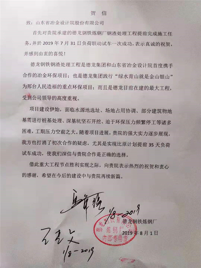 2019年7月31日14點58分,山冶設計總承包的德龍鋼鐵鋼渣處理項目負荷聯動試車一次成功!比原計劃工期提前35天!第二日,收到業主的賀信: