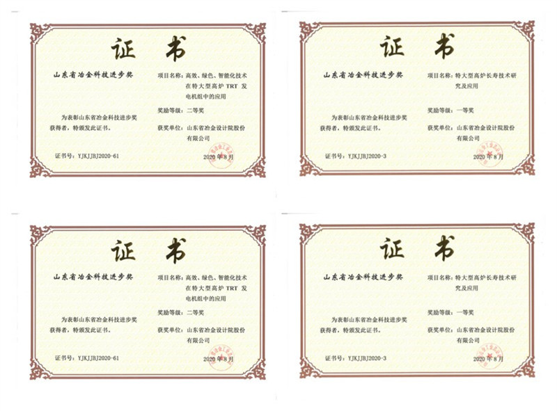 日前,山東省冶金工業總公司公布2020年度山東省冶金科技進步獎獲獎項目,其中我公司申報的《特大型高爐長壽技術研究及應用》、《大型燒結機節能環保綜合技術研究與應用》、《鋼管混凝土格構柱+主次桁架屋蓋重型冶金廠房體系研究與應用》3個項目榮獲一等獎,《高效、綠色、智能化技術在特大型高爐TRT 發電機組中的應用》榮獲二等獎。