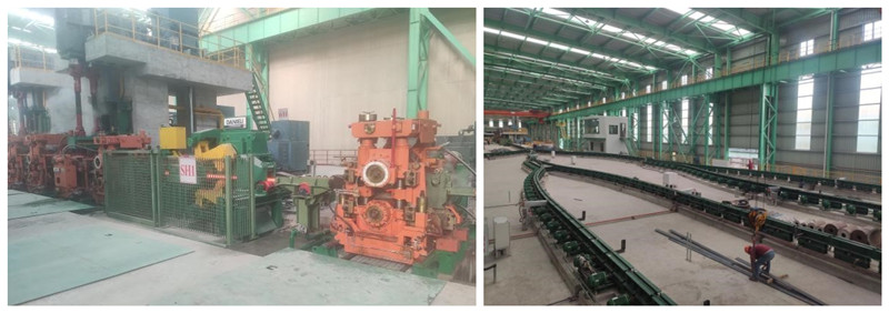 龍騰特鋼高速端板法蘭生產(chǎn)線是國內(nèi)采用全連軋工藝生產(chǎn)的高速端板法蘭軋鋼生產(chǎn)線,產(chǎn)品涵蓋國內(nèi)外端板法蘭的絕大部分規(guī)格要求。通過雙蓄熱步進式加熱爐加熱后,鋼坯進入11臺平立交替布置的高剛度短應(yīng)力線軋機,實現(xiàn)全連續(xù)無扭軋制。通過我院專利設(shè)備浮動式夾送輥和平立轉(zhuǎn)換裝置,不同規(guī)格的端板法蘭扁鋼可在軋制完成后實現(xiàn)快速平轉(zhuǎn)立,并通過轉(zhuǎn)轍器及卷前輥道分別輸送至6臺卷取機進行卷取。生產(chǎn)線配備先進的自動控制系統(tǒng),對全線物流進行跟蹤,實現(xiàn)工藝過程的自動化。先進的設(shè)備與合理的工藝流程,大大提高了生產(chǎn)線的生產(chǎn)效率和成材率,預(yù)計年產(chǎn)量可達50萬噸。
