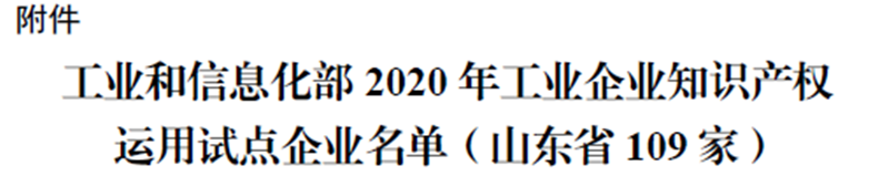 日前,國家工業和信息化部辦公廳發文公布,公司成功入選“2020年工業企業知識產權運用試點單位”,山東省共入選109家知識產權運用優秀企業。