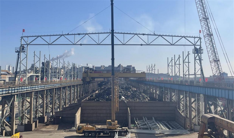 天管廢鋼料場揚塵治理項目EPC總承包工程首榀剛架梁順利吊裝