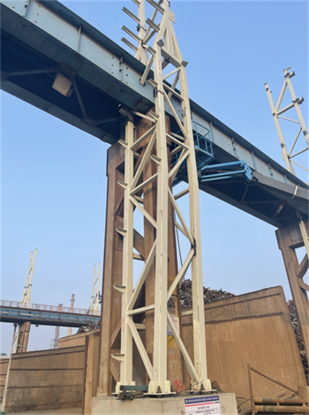 項目開工后,項目部將施工圖與現場實際巧妙結合,立足保證原棧橋系統完整、獨立運行為宗旨,攻克多項改造重點、難點。如利舊原有承臺短柱、鋼柱貫穿制動板現場加固、斜桿穿吊車梁腹板并規避電纜橋架等障礙物、大跨度屋面桁架梁跨外吊裝等。提前策劃好每個節點,做到現場施工完全落實設計意圖,實現了結構安全、質量可靠、進度可控、經濟合理。