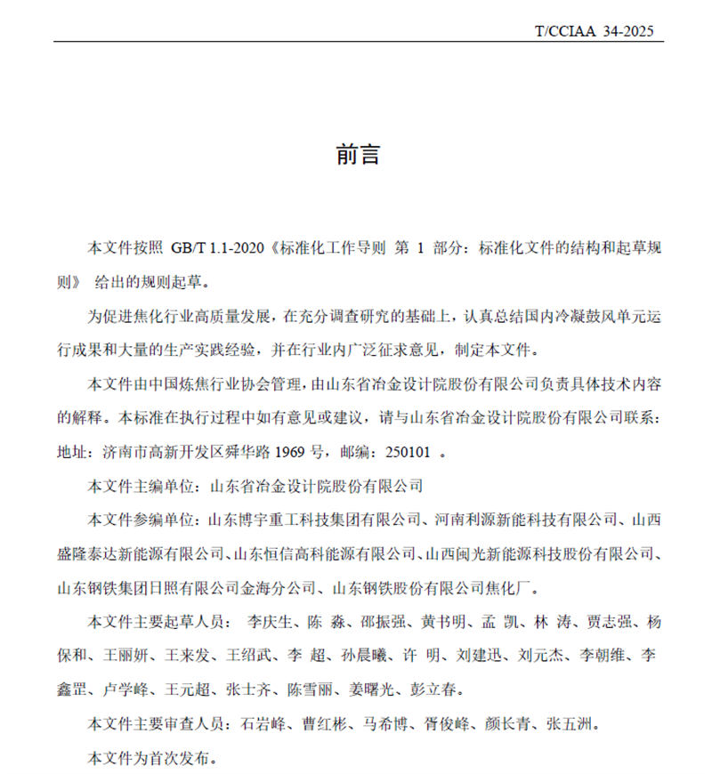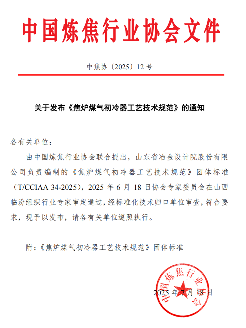 718日,由山冶設計主編的《焦爐煤氣初冷器工藝技術規范》T/CCIAA 34-2025(簡稱《規范》)正式發布并實施?!兑幏丁穼够簹鈨艋趵淦鞯墓に嚵鞒獭⒉僮鲄狄约百|量指標作出了詳細規定,同時統一了初冷器的設計與操作標準,保障了煤氣冷卻過程的高效性與安全性。《規范》的發布與實施,可指導焦化企業在生產過程中有效把控初冷器的日常操作,為后續煤氣凈化及深加工的穩定運行創造有利條件。這是繼202471日正式實施、山冶設計主編的《焦爐煤氣脫硫廢液干法制酸技術規范》YB/T6115 - 2023之后的又一個行業規范,充分體現了山冶設計在焦化行業的技術引領作用與品牌影響力。