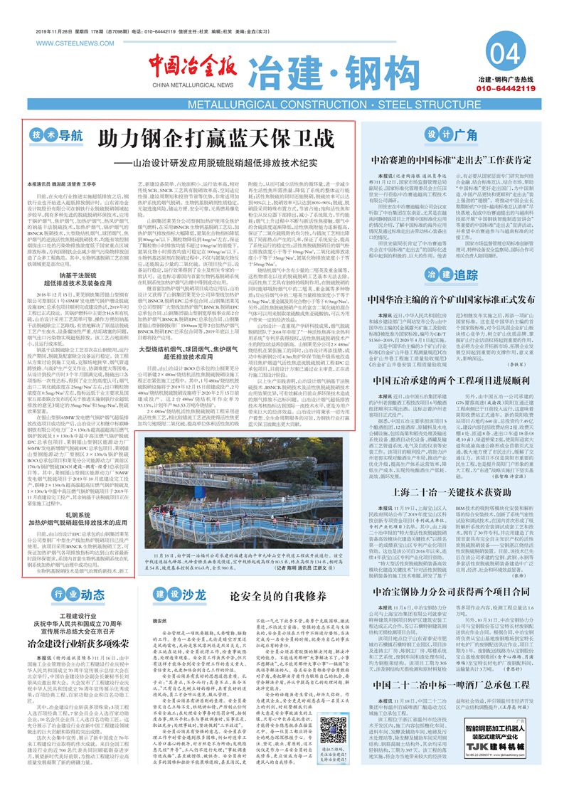 山冶設計脫硫脫硝超低排放技術助力鋼企打贏藍天保衛戰——脫硫脫硝超低排放技術開發及應用